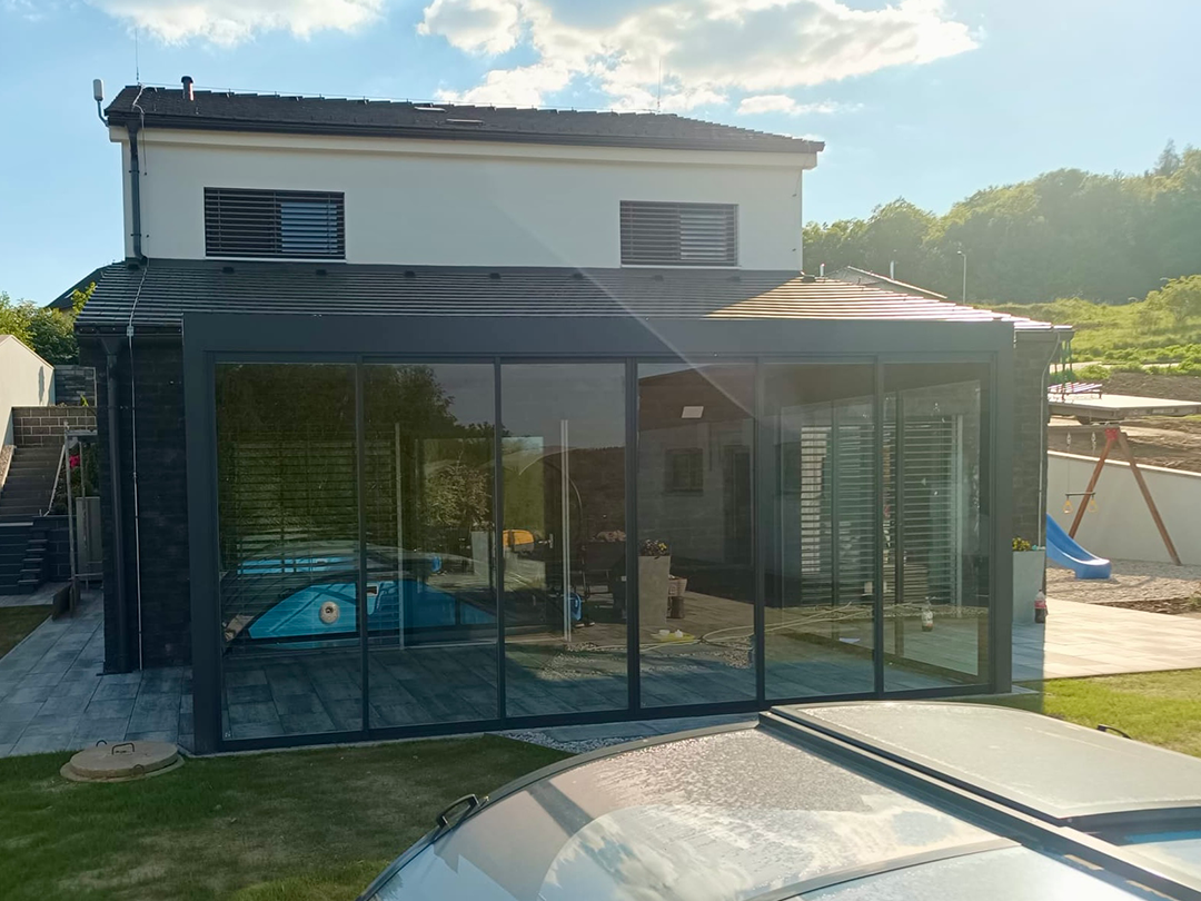 Ne, jen je nejvíc náročná na stínění. Problém nebývá jen teplo, ale hlavně nízké slunce z boku a sálání fasády a dlažby. Tady často funguje kombinace pergoly shora a boční ochrany (screeny).